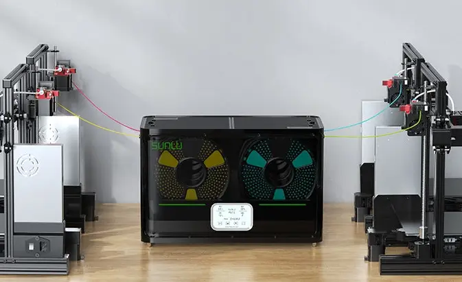 The S4 filament dryer from Sunlu can house up to four filament rolls. It is also possible to print directly from the dryer this ensures the perfect conditions for the filament and makes sure the filament is warm and dry.